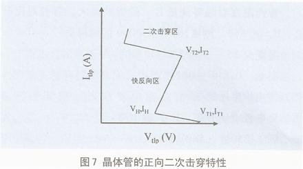 圖7是晶體管的正向擊穿特性,圖7中的VT·是器件的損傷點(diǎn),其定義有以下三種設(shè)定: