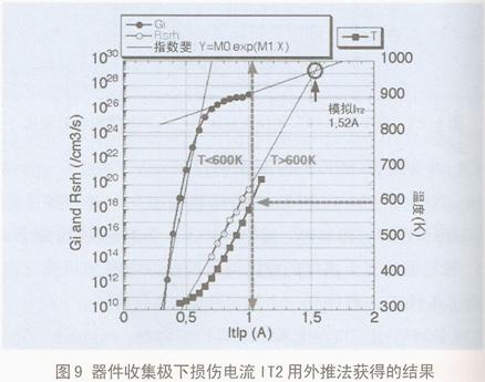 圖8是NPN管測(cè)量的和用(2)假定來(lái)模擬的I-V特性。由圖8可見(jiàn),測(cè)量的損傷電流IT2=1.5A,而模擬值是1..8A,有較大誤差。