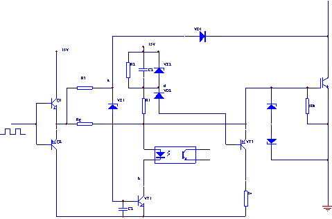 正常工作時,因故障檢測二極管VD1的導(dǎo)通,將a點的電壓鉗位在穩(wěn)壓二極管VZ1的擊穿電壓以下,晶體管VT1始終保持截止?fàn)顟B(tài)。當(dāng)電路發(fā)生過流或短路故障時,V1上的uce上升,a電壓隨之上升,到一定值時,VZ1擊穿,VT1通,b點電壓下降,電容C1通過電阻R1充電,電容電壓從零開始上升,當(dāng)電容電壓上升約1.4V時,晶體管VT2開通,柵極電壓uge隨電容電壓的上升而下降,通過調(diào)節(jié)C1的數(shù)值,可控制電容的充電速度,進(jìn)而控制uge的下降速度;當(dāng)電容電壓上升到穩(wěn)壓二極管VZ2的擊穿電壓時,VZ2擊穿,uge被鉗位在一固定的數(shù)值上,慢降柵壓過程結(jié)束,同時驅(qū)動電路通過光耦輸出過流信號傳送至單片機(jī),此時單片機(jī)發(fā)出聲光報警并開始運行延時程序。如果在單片機(jī)的延時過程中,故障信號消失了,則a點電壓降低, VT1恢復(fù)載止,C1通過R2放電,d點電壓升高,VT2也恢復(fù)截止,uge上升,電路恢復(fù)正常工作狀態(tài),單片機(jī)自動進(jìn)行復(fù)位。如果單片機(jī)在延時結(jié)束后,故障信號仍存在則由單片機(jī)切斷所有IGBT的輸入脈沖,設(shè)備停止工作,此時要通過手動復(fù)位才能恢復(fù)正常工作。這種電路既能保護(hù)逆變電路和IGBT的安全,又不會在瞬時過流時中斷逆變電源工作所以是一種非常有效的保護(hù)方式。