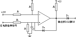 過電流保護(hù)采用電流互感器作為電流檢測元件,其具有足夠快的響應(yīng)速度,能夠在IGBT允許的過流時間內(nèi)將其關(guān)斷,起到保護(hù)作用。如圖1所示,過流保護(hù)信號取自CT2,經(jīng)分壓、濾波后加至電壓比較器的同相輸入端,如圖4所示。當(dāng)同相輸入端過電流檢測信號比反相輸入端參考電平高時,比較器輸出高電平,使D2從原來的反向偏置狀態(tài)轉(zhuǎn)變?yōu)檎驅(qū)ǎ淹喽穗娢惶嵘秊楦唠娖剑闺妷罕容^器一直穩(wěn)定輸出高電平。同時,該過電流信號還送到SG3525的腳10。當(dāng)SG3525的腳10為高電平時,其腳11及腳14上輸出的脈寬調(diào)制脈沖就會立即消失而成為零。