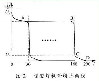 圖2所示即為高頻逆變焊機所普遍采用的一種行之有效的恒流帶外拖的外特性曲線。其中Uk為空載電壓,即焊機不工作時的輸出電壓。一個較高的空載電壓有助于起弧階段快速建立起穩(wěn)定的工作狀態(tài)。一般空載電壓為90V左右;AB段為起弧階段,即焊機建立工作狀態(tài)的過渡過程,近似于恒壓輸出。這個過程中變換器以最大脈寬輸出,以最快速度達到設定工作電流時該階段結束;BC段為穩(wěn)定工作階段,近似為恒流過程,使焊機具有一個平穩(wěn)、恒定的工作電流;CD段為外拖階段,由于焊機在頻繁的起弧和工作過程中焊槍很容易和工件短路粘連,造成焊接過程不順暢,如果此時系統(tǒng)檢測到一個較低的短路電壓后能夠相應地增大輸出電流值,就可以將粘連部分熔斷,從而獲得一個連續(xù)、平穩(wěn)的焊接過程。