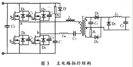 本系統(tǒng)所采用的全橋變換器拓撲結構如圖3所示。主電路中選用了MOSFET作為主功率開關器件,這是因為本系統(tǒng)的設計頻率為100 kHz,而與IGBT一般最高工作在幾十kHz相比,MOSFET的工作頻率則要高的多。另外由于MOSFET自身帶有反并聯(lián)二級管和較大的輸出電容,如圖3中D1~D4、C1~C4所示,為軟開關的實現(xiàn)提供了便利條件。變壓器副邊輸出整流結構有全波整流(變壓器副邊三抽頭+兩只二級管)和全橋整流(變壓器副邊兩抽頭+四只二級管)兩種結構可供選擇,前者適合于輸出低壓大電流的場合,后者適合于輸出高壓小電流場合。由于逆變焊機可看作是一個低壓大電流源.因此選用全波整流。