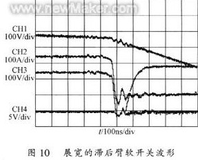 其中通道l和通道2分別為原邊電流、電壓波形;通道3為滯后臂管壓降,通道4為其驅動波形。圖10是圖9的局部展寬波形。從中可以明顯地看到當滯后臂管壓降已經諧振到零后,驅動脈沖才由低變到高,使其在零電壓下導通,實現(xiàn)軟開關。