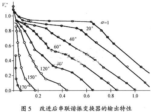圖4中最大的功率曲線(α=1)即對(duì)應(yīng)于變換器開(kāi)環(huán)工作,圖4中停留在底部的曲線是對(duì)應(yīng)于輕載的情況。工作在歸一化的輸出電流I*o=0.15%且ψ=1時(shí),結(jié)果產(chǎn)生大約30%的過(guò)壓。改進(jìn)變換器的輸出特性為雙斜率輸出特性,使電路提高了電壓、電流限制的固有能力,改善了高壓電源的空、滿載的適應(yīng)性,同時(shí)有利于高壓電源寬范圍的輸出調(diào)節(jié)。