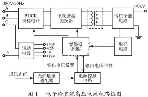 電子槍直流高壓電源采用380V/50Hz三相四線輸入,最高輸出直流電壓為負(fù)極性70kV,電源長(zhǎng)期運(yùn)行工作為-60kV左右,在滿足穩(wěn)定度要求條件下,輸出直流高壓電壓的連續(xù)可調(diào)范圍不小于-40~-70kV。