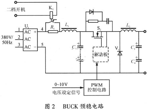 三相交流配電經(jīng)整流濾波電路之后,形成500V左右的直流電壓加在。BUCK預(yù)穩(wěn)電路的輸入端。其中K1為抑制合閘浪涌電壓而設(shè)置的,其二檔吸合信號(hào)由電源控顯電路給出。S2為BUCK功率開(kāi)關(guān)管,其工作脈沖由PWM控制電路給出,為了保證電源具有足夠的動(dòng)態(tài)特性,該功率開(kāi)關(guān)管工作頻率為100kHz左右。PWM控制器輸出脈沖寬度,由電壓設(shè)定信號(hào)給出。當(dāng)電壓設(shè)定信號(hào)由0~10V變換時(shí),PWM控制器輸出的脈沖占空比在0~0.85的范圍內(nèi)變化。L2為儲(chǔ)能電感,由于BUCK電路的占空比在0~0.85大范圍變化,為了保證電路起到預(yù)穩(wěn)作用,需要避免輸出電流斷續(xù),同時(shí)不至于設(shè)計(jì)余量過(guò)大,采用了額定負(fù)載條件下的計(jì)算值,實(shí)際工作情況良好。
