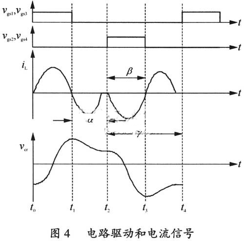 電路的諧振槽路的電流波形和驅(qū)動(dòng)信號(hào)波形如圖4所示,通過(guò)調(diào)節(jié)α角控制變換器的輸出功率。