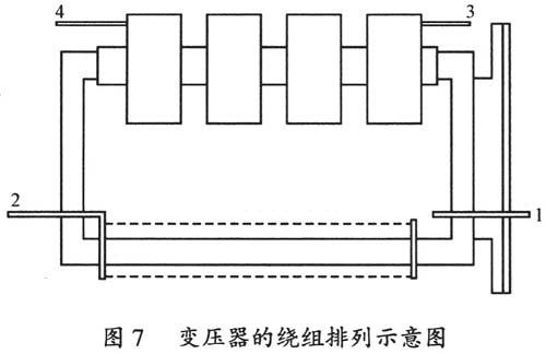 為了減少高壓繞組和低壓繞組之間的分布電容,確保高壓繞組和低壓繞組之間的絕緣,需要將原邊繞組繞制在矩形鐵心的一邊,副邊繞組繞制在矩形鐵心的另一邊,并留足原、副邊間的距離,最后用環(huán)氧樹(shù)脂灌注作為主絕緣。