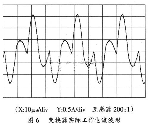 整個(gè)變換器電路依然采用PFM的工作模式,當(dāng)前級(jí)預(yù)穩(wěn)電源輸出0~500V直流電壓時(shí),變換器以固定的脈沖寬度驅(qū)動(dòng)橋臂的功率開(kāi)關(guān)管。為了保證電源在電子槍束流產(chǎn)生時(shí)能穩(wěn)定工作,設(shè)計(jì)了取樣閉環(huán)控制功能,當(dāng)輸出偏離電壓設(shè)定值時(shí),變換器通過(guò)脈沖頻率調(diào)節(jié)得到穩(wěn)定的輸出,電子槍高壓電源實(shí)際工作頻率為3~25kHz。改進(jìn)后的串聯(lián)諧振變換器如圖5所示,變換器的實(shí)際工作電流波形如圖6所示。