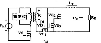 當(dāng)主開關(guān)管VS 關(guān)斷時,勵磁電流流經(jīng)磁復(fù)位電路。變壓器次級電壓反向,VS1 和VS3 關(guān)斷。VS2 的柵2源極寄生電容由流經(jīng)VD 的電流充電。輸出電流由VS2 續(xù)流。在t2 時刻,磁復(fù)位結(jié)束,變壓器次級電壓為零。因為VD1 承受反壓截止,VS3 關(guān)斷,VS2 的柵極驅(qū)動電壓不變,因此即使變壓器次級電壓為零,VS2 保持導(dǎo)通續(xù)流。VS2 柵極驅(qū)動電壓一直保持到下一個開關(guān)周期開始,且VS3 導(dǎo)通之時。這就解決了死區(qū)時間內(nèi)體二極管導(dǎo)通的問題。