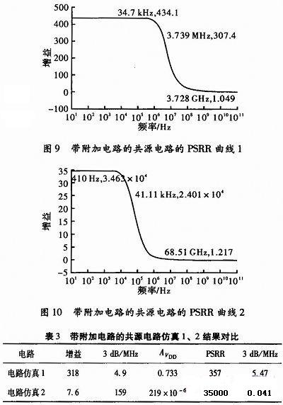 帶附加電路的共源電路如圖7和圖8所示,消除了使用工作以線性范圍內(nèi)的共源放大器,從VDD到輸出節(jié)點電源波動的影響。