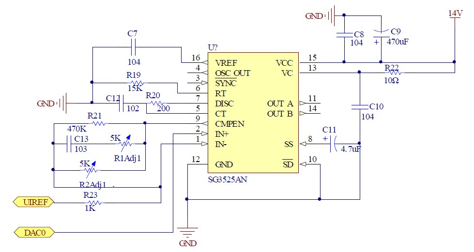 PWM 控制芯片采用SG3525。SG3525 的主要特點是:輸出級采用推挽輸出,雙通道輸出,占空比0 - 50%可調。每一通道的驅動電流最大值可達200mA,灌拉電流峰值可達500mA。
