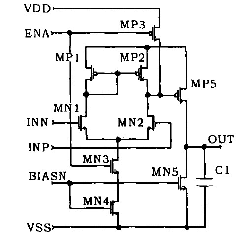 過放電檢測電路(VD2)可利用一個二級開環比較器來實現,如圖2所示。在設計中應采用差分輸入并盡可能地提高增益,以滿足精度要求。該電路中,第一級是由MN1,MN2,MP1,MP2,MN3,MN4組成的差分放大器。第二級是由MP5,MN5組成的單級放大器。前級放大器放大輸入的差模信號,后一級將前級的輸出進一步放大,以達到數字信號的輸出電平。該比較器電路的直流增益為: