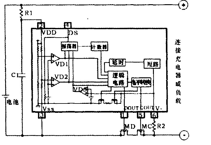 圖1中,DOUT為過放電檢測的CMOS輸出,COUT為過充電檢測的CMOS輸出,VDD為電池電壓輸入,VSS為芯片接地引腳,DS為響應延遲時間縮短控制輸入端,V-為放電過流檢測端。