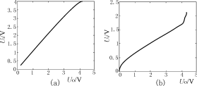 根據所設計的檢測電路進行實驗,實驗時,調節輸入電壓Ui的大小,并檢測與之對應的輸出電壓UO的大小,實驗結果如表1(a)所示。為了進行對比,同時測出沒有反饋的光耦的輸入與輸出電壓關系,并列在表1(b)。根據表1中(a)、(b)的數據分別繪出檢測電路與單個光耦的傳輸特性,分別如圖3(a)、(b)所示。