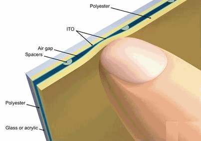 相反地,這種技術的主要缺點源于觸控屏幕的多層結構。其基層一般是玻璃,表面涂有一層均勻的ITO,頂層通常由聚乙烯對苯二甲酸酯(PET)制造,內表面(Inner Surface)也涂有一層均勻的ITO,而外表面(Outer Surface)則有硬涂層,以為保護作用,而形成空氣隙以把這些導電層隔離開的細小透明間隔點常在打印制程中產生。這種多層材料堆棧的多層結構對透光性有所影響,一般將降至約透明玻璃透光率的75%,同時,空氣間隙可能產生薄霧效應,進一步降低清晰度。此外,這種結構很容易刮傷損壞,而且因為機械軸性不重合,還須仔細校準以確定X、Y坐標范圍,其它弱點還包括可能吸收電氣噪聲,尤其是來自液晶顯示器(LCD),這時一般須進行濾波,將導致反應時間的延長,當然,控制器一次只能處理一個觸摸位置,也是一大局限。