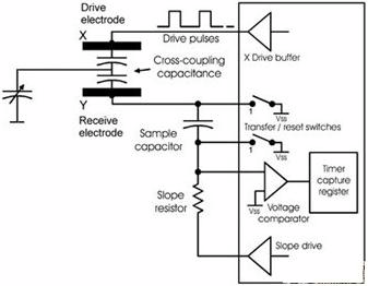 和RC及AC技術相同,單端電荷轉移電容傳感器也是在每個感測通道采用一個電極板,但不依賴于時序測量或放大器,而是采用互補式金屬氧化物半導體(CMOS)開關把電荷泵入Cx,并把電荷轉移到一個參考采樣電容(Cs)中。透過計算Cs達到預先設定的電壓值所需的周期數,就可很容易求得電荷電平,且這個周期數與Cx成反比。眾所周知,電荷轉移方法有助于抑制泄漏電流的影響,而且由于其采用一個很大的Cs作為檢測器,這個檢測器相當于對外界的一個低阻抗,故其抗外部電氣噪聲的能力非常強。