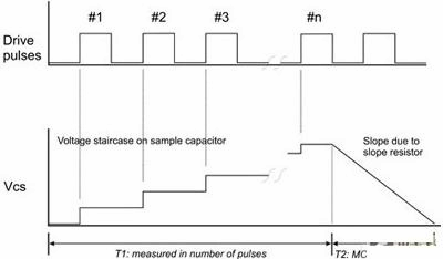 脈沖串產生的第一個斜坡是加到采樣電容上的梯級波形訊號,脈沖串過后,驅動器把斜率電阻的參考端切換為高電平,對采樣電容進行放電,直到將電荷用完,電壓比較器檢測出零交叉點為止,獲得零交叉點所需的斜坡時間與X、Y電荷耦合成比例,并隨用戶手指觸摸面板表面而減小(圖5)。