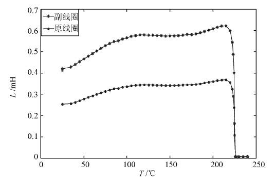 實(shí)驗(yàn)中還測試了電路中的輸入輸出的其他電感元件的電感量隨溫度的變化。在整個加熱階段,其他元件的電感量隨溫度變化很小,與變壓器電感量變化相比可以忽略。而且在變壓器電感量下降的階段,其他電感元件的電感量變化仍然較小。