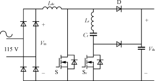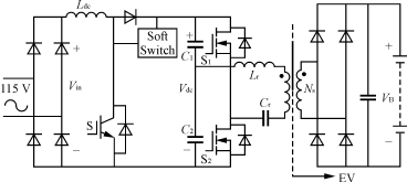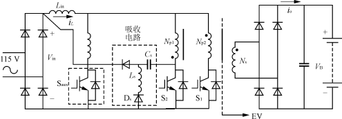 另一個降低器件電壓定額的方案是采用兩級變換結構。前級PFC校正環節可以采用帶有軟開關功能的Boost變換器,允許高頻工作。后級DC/DC功率變換級,可以采用半橋串聯諧振變換器,提供高頻電流鏈。圖7給出了適用于充電模式1的兩級功率變換電路結構圖。