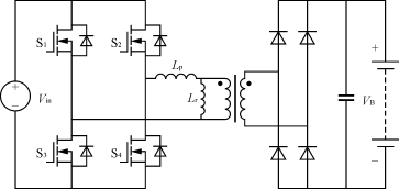 與充電模式2類似,充電變換器可以直接采用全橋或帶諧振的全橋變換器。但是,由于充電模式3功率級更高,與諧振式全橋變換器相比,一般的全橋變換器必然會對應很高的峰值電流。因此,應當考慮采用ZVS或ZCS諧振全橋拓撲來有效降低損耗。