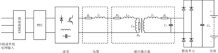 圖2給出電動汽車感應耦合充電系統的簡化功率流圖。圖中,輸入電網交流電經過整流后,通過高頻逆變環節,經電纜傳輸通過感應耦合器后,傳送到電動汽車輸入端,再經過整流濾波環節,給電動汽車車載蓄電池充電。
