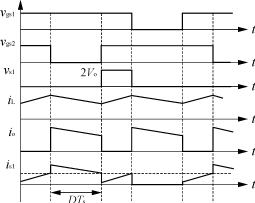 當原邊開關管S1及S2均開通時,能量儲存在輸入濾波電感中,同時輸出整流管處于關斷態。當開關管S1及S2中任一個開關管關斷時,儲存能量通過原邊繞組傳輸到副邊。由于變換器的對稱工作,變壓器磁通得以復位平衡。