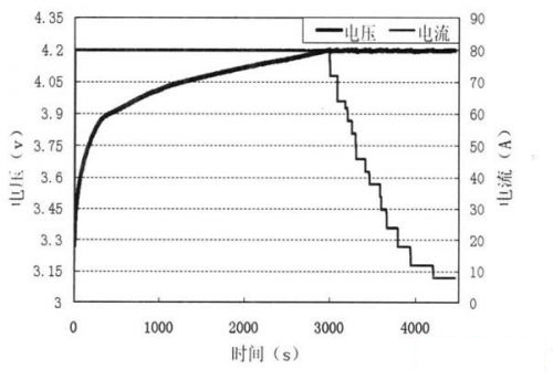 為了測試該系統(tǒng), 使用3. 7V /80Ah的錳酸鋰電池做恒流恒壓充電試驗。在上位機程序中設(shè)置如下參數(shù): 恒流階段充電電流80A, 充電截止電壓4. 2V,恒壓階段截止電流0. 1A, 得到的充電曲線如圖4所示。