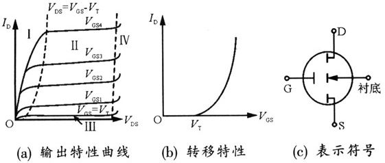 圖2 N溝道增強(qiáng)型絕緣柵場效應(yīng)管的特性曲線和表示符號(hào)[page]