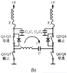 因?yàn)樵谟玫墓Ψ拍K產(chǎn)生的射頻電流必須流過合成變壓器的次級(jí),并在已關(guān)斷的射頻功放模塊的初級(jí)繞組上感應(yīng)出射頻電壓。根據(jù)楞次定律,變壓器次級(jí)電流所產(chǎn)生的磁通總是試圖抵消初級(jí)電流所產(chǎn)生的磁通,所以,流過關(guān)斷功放輸出變壓器次級(jí)的電流感應(yīng)到初級(jí)的電壓后,一定和原來的輸出電壓極性相反。在如圖6(a)所示,由次級(jí)電流感應(yīng)到初級(jí)的電壓為左正右負(fù),說明關(guān)斷的射頻功放在導(dǎo)通狀態(tài)下的變壓器初級(jí)電壓極性是左負(fù)右正,與此相對(duì)應(yīng)的導(dǎo)通管為Q2/Q4,截止管為01/Q3,從而形成的低阻抗通路為:與Ql/Q3相并聯(lián)的反向二極管→旁路電容C1、C3→旁路電容C2、C4→Q2/Q4→隔直電容C。同理,圖6(b)所形成的低阻抗通路為:與Q2/Q4相并聯(lián)的反向二極管→旁路電容C2、C4→旁路電容C1、C3→Q1/Q3。