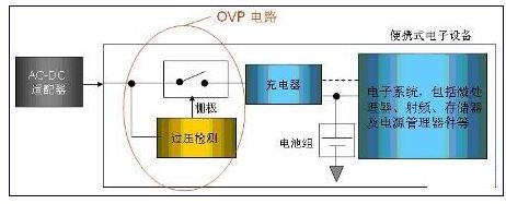 根據(jù)YD/T 1591-2006標(biāo)準(zhǔn),手機(jī)側(cè)充電控制電路應(yīng)具備過(guò)壓保護(hù)裝置,也就是在手機(jī)充電接口導(dǎo)入直流6 V以上電壓時(shí),如果不能保證安全充電,應(yīng)啟動(dòng)保護(hù),在非預(yù)期電壓的情況下,不應(yīng)出現(xiàn)過(guò)熱、燃燒、爆炸以及其它電路損壞的現(xiàn)象,而且恢復(fù)后,手機(jī)應(yīng)能正常工作。如圖4所示,過(guò)壓保護(hù)(OVP)電路在檢測(cè)到過(guò)壓故障狀況時(shí),檢測(cè)電路就會(huì)將開(kāi)關(guān)打開(kāi),使電子負(fù)載與電源斷開(kāi),從而使得包括微處理器、射頻、存儲(chǔ)器和電源管理器件等核心芯片遭受過(guò)壓損傷。
