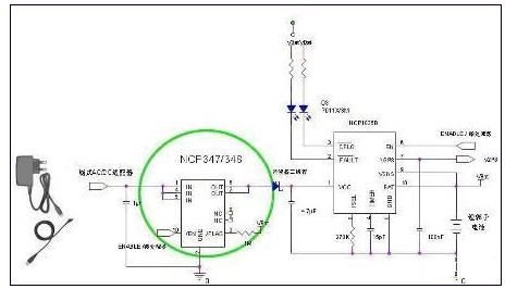 圖5:集成式OVP解決方案NCP348的應(yīng)用電路示意圖。
