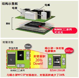 此次羅姆開發(fā)的“BZ6A系列”將6MHz動作的高速開關(guān)電源IC“BU9000X系列”內(nèi)置于基板,同時,將所需零部件封裝于一體。不僅保持了產(chǎn)品的高性能,而且實(shí)現(xiàn)了業(yè)內(nèi)最小尺寸的超小型電源模塊。由于不再需要外置零部件,因此,簡化了開關(guān)電源電路的設(shè)計的同時使超小型化、高密度封裝成為可能,為縮短各種設(shè)備的開發(fā)周期做出了巨大貢獻(xiàn)。另外,輸入電壓范圍更寬,達(dá)2.3V~5.5V,因此,可用于具有USB 接口、5V輸出的移動設(shè)備等。不僅如此,輸出電壓還可個別對應(yīng)1.0V~3.3V范圍的產(chǎn)品,不僅可用于移動設(shè)備,還可用于其他各種產(chǎn)品中。