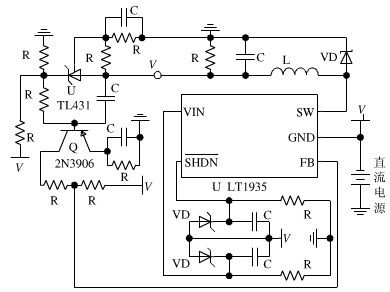本文設計的非隔離負電壓DC/DC開關電源如圖4所示,負電源工作在連續電流模式。當電源控制器LT1935內部的功率三極管導通時,直流電源給輸出電感L1和輸出電容C1充電。當電源控制器LT1935內部的功率三極管關斷時,輸出電感L1中的電流改由通過肖特基二極管VD1提供的低阻抗回路繼續給輸出電容C1充電直至下一個周期電源控制器LT1935內部的功率三極管再次導通。可見電容C1在輸出電感L1儲存能量和釋放能量的過程中均獲得充電,從而減小了輸出紋波電壓。同時,在CCM條件下,輸出電流在LT1935內部功率三極管的導通和關斷期間均通過輸出電感L1,這很大程度上抑制了輸出電流的波動,降低了輸出紋波電流的影響,進而大大增加系統的帶負載能力和效率。