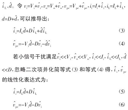 圖6給出圖5利用平均電路法建立的非隔離負電壓Buck開關電源CCM大信號模型。設Vi為輸入電壓的穩態值,Vo為輸出電壓的穩態值,Vpc為受控電壓源兩端電壓的穩態值,Ii為輸入電流的穩態值,IL為輸出電感電流的穩態值,D為占空比的穩態值。