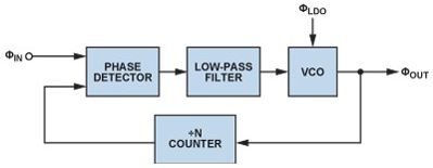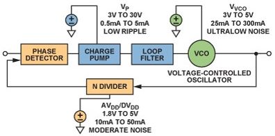 鎖相環(huán)(PLL)是現(xiàn)代通信系統(tǒng)的基本構(gòu)建模塊PLLs通常用在無線電接收機(jī)或發(fā)射機(jī)中,主要提供"本振"(LO)功能;也可用于時(shí)鐘信號分配和降噪,而且越來越多地用作高采樣速率模數(shù)或數(shù)模轉(zhuǎn)換的時(shí)鐘源。由于每一代PLL的噪聲性能都在改善,因此電源噪聲的影響變得越來越明顯,某些情況下甚至可限制噪聲性能。本文討論圖1所示的基本PLL方案,并考察每個(gè)構(gòu)建模塊的電源管理要求。