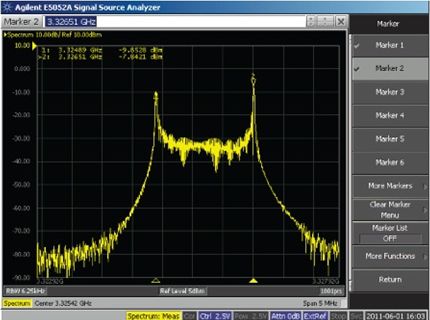 另一種方法:將低頻方波直流耦合至電源內(nèi),同時(shí)觀察VCO頻譜任一側(cè)上的頻移鍵控 (FSK)調(diào)制峰值(圖2)。峰值間頻率偏差除以方波幅度,便得出VCO推壓系數(shù)。該測量方法比靜態(tài)直流測試更精確,因?yàn)橄伺c直流輸入電壓變化相關(guān)的任何熱效應(yīng)。圖2顯示ADF4350 VCO輸出在3.3 GHz、對標(biāo)稱3.3 V電源施加10 kHz、0.6 V p-p方波時(shí)的頻譜分析儀曲線圖。對于1.62 MHz/0.6 V或2.7 MHz/V的推壓系數(shù),最終偏差為3326.51 MHz – 3324.89 MHz = 1.62 MHz.該結(jié)果可與表1中的靜態(tài)測量 2.3 MHz/V比較。