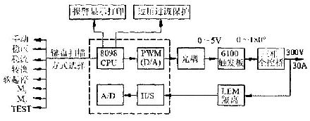 系統(tǒng)工作在開環(huán)狀態(tài),利用8098的PWM口,經(jīng)濾波后輸出一個0~5V的控制電壓信號給觸發(fā)板,使整流橋相應輸出電壓為0~300V.該方式主要用于系統(tǒng)主電路的檢修和維護。
