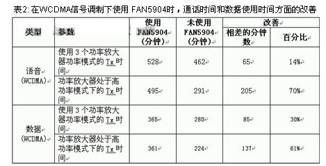 表2顯示了圖1和圖2的結果,以及功率放大器只工作于高功率模式下相應的分鐘數。在HSUPA、CDMA200 1x EV-DO和TD-SCDMA等不同信號調制模式下,電流消耗和通話時間都有類似的改善。這里把高功率模式工作的通話/數據使用時間一起顯示的原因是:新技術不僅得到了更多的分鐘數,從設計角度來看,亦簡化了校準工作。當功率放大器具有多種功率模式時,固件必需適應何時從一個等級切換到下一個等級,因為在整個輸出功率范圍內,每個功率放大器的每種功率模式都存在獨特的VPA-POUT 曲線。由于現在大多數手機都支持至少三個頻段,這意味著滿足要求的系統中可能有三種3G功率放大器,所以增加了復雜程度。在處于一種功率模式的功率放大器中使用FAN5904,可以消除模式切換帶來的復雜性,更快地進行功率放大器校準,因為需要的校準點較少。這樣就縮短了測試/校準的時間,并且降低了制造成本,同時簡化了設計過程。
