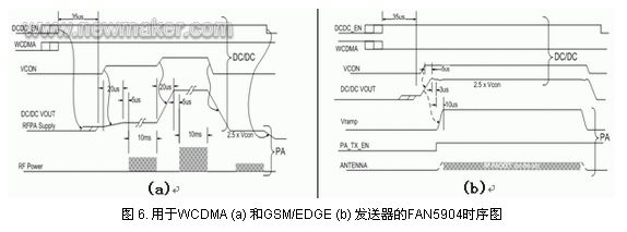 在輸出功率需要從低水平變到高水平,或者從啟動開始,瞬態響應時間為10?s。對于降壓穩壓器而言,關鍵是使功率放大器滿足這些規范要求,避免出現通話中斷或者通話語音質量不良的情況。由于用戶在不同的區域移動,信號覆蓋情況或好或壞,雖然如此,通話中斷現象是用戶所不能容忍的。對于GSM/EDGE模式,FAN5904能夠在5?s內完成電壓之間的跳變,滿足GSM規范。圖6所示為用于WCDMA和GSM /EDGE發送器的FAN5904時序圖。
