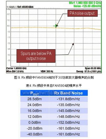 為了進一步了解降壓轉換器帶來的噪聲/尖刺情況,根據3G功率放大器自身的噪聲輸出,對接收頻段內的噪聲進行了測量和比較。圖9顯示在28.5dBm的最高輸出功率下,來自FAN5904的尖刺水平實際上遠遠低于功率放大器的噪聲水平,表4顯示,來自FAN5904 的噪聲在-131.8dBm/Hz處最大,但仍然遠遠低于功率放大器自身的-90dBc。RF工程師可以放心,FAN5904在PWM和PFM模式工作時不會對蜂窩和其它RF頻譜的發送和接收頻段造成干擾。