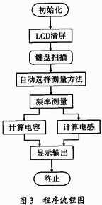 系統上電初始化并且清屏,單片機初始化完成后,進入鍵盤掃描程序,當要進行電容或電感測量時,選擇測量按鍵,系統進行自動判斷并進行電容或電感的測量。當判斷為電容時,系統選擇電容的計算方法。當判斷為電感時,系統選擇電感的計算方法。計算完成后在液晶屏上顯示測量結果。下面是具體的程序流程圖,如圖3所示。