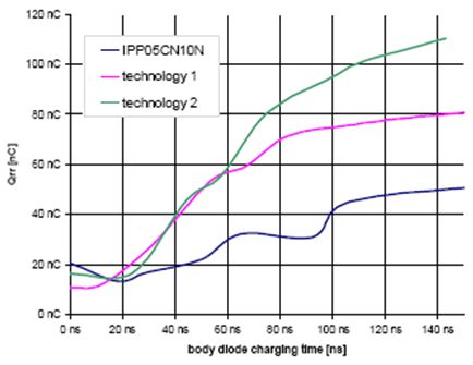對(duì)于優(yōu)化能效,MOSFET內(nèi)部的體二極管具有關(guān)鍵作用。在每個(gè)開(kāi)關(guān)循環(huán)中,在MOSFET被關(guān)斷之前,體二極管通常會(huì)通電,反向恢復(fù)電荷Qrr*也由此積聚起來(lái)。在第3節(jié)中已經(jīng)提到,數(shù)據(jù)手冊(cè)中所載Qrr與實(shí)際Qrr*有所出入。數(shù)據(jù)手冊(cè)中的值是按di/dt為100 A/μs測(cè)得的,二極管被施以最高漏極電流,并且MOSFET關(guān)斷前的導(dǎo)通時(shí)間長(zhǎng)達(dá)500 μs左右甚至更長(zhǎng)。因此,所測(cè)得的值是盡可能最高的Qrr*。此外,JEDEC標(biāo)準(zhǔn)所規(guī)定的測(cè)定方法不僅包含了Qrr*,而且包含MOSFET的部分輸出電荷,因而得到的總值很高,與實(shí)際值不相符。需要強(qiáng)調(diào)的是,雖然在實(shí)際應(yīng)用中,di/dt可能高達(dá)1000 A/μs,并且di/dt越高,Qrr*也越高。但是,Qrr*主要取決于電流和二極管導(dǎo)通時(shí)間。由于在實(shí)際應(yīng)用中,電流僅為最高漏極電流的一半甚或更低,并且二極管導(dǎo)通時(shí)間僅為50 ns至150 ns,因此實(shí)際Qrr*值比數(shù)據(jù)手冊(cè)中的值低得多。