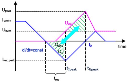 點(diǎn)2時(shí),MOSFET通道關(guān)斷,然而,在輸出扼流圈的驅(qū)動(dòng)下,電流不得不繼續(xù)流動(dòng)。這迫使電流轉(zhuǎn)而流向MOSFET的體二極管,使得開(kāi)關(guān)發(fā)生負(fù)電壓降UD。在圖2中,這段時(shí)間被標(biāo)記為tD。在點(diǎn)3開(kāi)啟一次側(cè)之后,電流不得不下降。如果一次側(cè)MOSFET的開(kāi)啟速度很快,那么,二次側(cè)的環(huán)路電感將限制電流換向,從而形成恒定的di/dt。在這個(gè)階段(tramp),漏源電壓波形會(huì)出現(xiàn)一個(gè)MOSFET的源極電感造成的電壓降,并且受負(fù)di/dt的影響,漏源電壓現(xiàn)在也轉(zhuǎn)為正向。當(dāng)電流穿過(guò)零位線(點(diǎn)4)后,電流不再流經(jīng)體二極管。因此,二極管上的正向壓降也變?yōu)榱悖瑢?dǎo)致UDS波形再次發(fā)生一個(gè)值為體二極管正向壓降UD的正向壓降。穿過(guò)零位線后,電流以不變的di/dt保持流動(dòng)。不過(guò),現(xiàn)在電流的方向?yàn)樨?fù),正在將體二極管的反向恢復(fù)電荷Qrr*移走,并對(duì)MOSFET的輸出電容Coss充電。在這種情況下,Qrr*僅被視為MOSFET體二極管的反向恢復(fù)電荷,而數(shù)據(jù)手冊(cè)中的Qrr則是按照J(rèn)EDEC標(biāo)準(zhǔn)測(cè)得的,因此,除體二極管Qrr*之外,還包含部分MOSFET輸出電荷Qoss(詳細(xì)情況請(qǐng)參見(jiàn)第4節(jié))。在對(duì)Coss充電的同時(shí),MOSFET的電壓也開(kāi)始朝著變壓器電壓升高。點(diǎn)5時(shí),達(dá)到最高反向電流Irev_peak,也就是說(shuō),經(jīng)過(guò)充電現(xiàn)在Coss已經(jīng)達(dá)到變壓器電壓。在理想狀況下,這個(gè)系統(tǒng)現(xiàn)在應(yīng)當(dāng)處于穩(wěn)定狀態(tài),但是,系統(tǒng)中仍然存在如下電量: