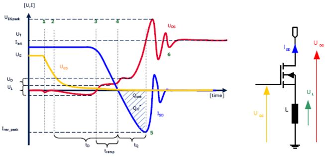 分析首先從開(kāi)關(guān)的導(dǎo)通狀態(tài)開(kāi)始:此時(shí),柵極電壓很高,漏源電壓幾乎為零,電流從源極流向漏極。在點(diǎn)1時(shí),柵極被關(guān)斷。在UDS波形中,這表現(xiàn)為柵極電容CG放電產(chǎn)生的負(fù)電壓驟降很小。此放電會(huì)在MOSFET的源極連接處產(chǎn)生具有大的電流變化(di/dt)的電流峰值。在感應(yīng)作用下,源極的這種電感會(huì)引起UDS波形發(fā)生壓降。