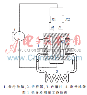 熱導檢測器是利用被測成分和載氣的導熱系數不同而響應的濃度型檢測器,如圖1為熱導檢測器工作原理圖。由圖1可以看出,只通入載氣時,惠斯通電橋處于平衡狀態,M、N兩點電位相等,電位差VMN為零。再通入樣氣后,由于參考臂上通入的是純載氣,而測量臂上通入的是載氣和樣氣的混合氣體,其導熱系數不同于純載氣,從熱絲向四周傳導的熱量也就不同,從而引起兩臂熱絲溫度不同,進而使兩臂熱絲阻值不同,電橋平衡破壞。M、N兩點電位不等,即存在電位差VMN不為零,通過對VMN電壓進行檢測、分析,從而定性、定量地測出被測物質的成分和含量。