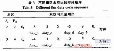 空間矢量調(diào)制法只確定開關(guān)間隔中應用電壓矢量的占空比,從而獲得低頻率的輸出電壓和輸入電流的平均值,但是并沒有確定使用的順序。所以需要使用雙空間矢量調(diào)制法,同時也可改善波形的質(zhì)量。圖2表明了輸入電流在4扇區(qū),輸出電壓在5扇區(qū)應用雙空間矢量調(diào)制的順序。電壓矢量在開關(guān)間隔中對稱分布,零矢量每4個開關(guān)間隔使用一次。在每次開關(guān)轉(zhuǎn)換中只有一個開關(guān)狀態(tài)發(fā)生改變以最大程度地降低損耗。在圖2中通過表格2確定相應開關(guān)時間: