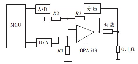 在該電源系統(tǒng)中, 主要為負(fù)載提供大電流, 采用PID 控制算法控制負(fù)載的發(fā)光強(qiáng)度。輸入為單片機(jī)經(jīng)DAC輸出的控制電壓, 一路為比例放大電路, 如圖1 所示增益G=1+R3/R2.電流型DAC 通過(guò)R1 轉(zhuǎn)換成電壓, 控制OPA549 .輸出電流經(jīng)采樣電阻轉(zhuǎn)換為采樣電壓, 送入A/D 轉(zhuǎn)換器反饋至單片機(jī)進(jìn)行偏差值補(bǔ)償。