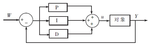 PID 控制原理如圖2 所示。PID 控制是一種線性調(diào)節(jié)器, 它把設(shè)定值W 與實(shí)際輸出值相減, 得到控制偏差e .偏差值e 經(jīng)比例、積分、微分后通過(guò)線性組合構(gòu)成控制量U, 對(duì)對(duì)象進(jìn)行控制。其中比例調(diào)節(jié)器起到基礎(chǔ)調(diào)節(jié)作用, 主要對(duì)控制系統(tǒng)的靈敏度和控制速度有影響。積分調(diào)節(jié)器可以自動(dòng)調(diào)節(jié)控制量, 消除穩(wěn)態(tài)誤差,使系統(tǒng)趨于穩(wěn)定。微分調(diào)節(jié)器可以減小超調(diào), 克服振蕩, 同時(shí)加快系統(tǒng)的穩(wěn)定速度, 縮短調(diào)整時(shí)間, 從而改善系統(tǒng)的動(dòng)態(tài)性能。