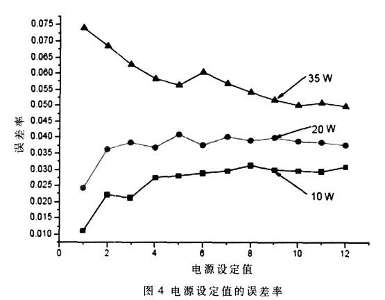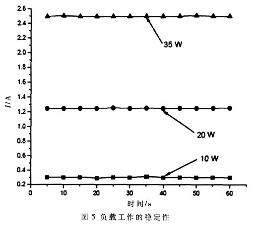 由于輸出電流達(dá)到8 A, 對(duì)電源的功率要求較高, 易產(chǎn)生噪聲, 這種隨機(jī)噪聲也會(huì)對(duì)輸出電流產(chǎn)生一定的影響。為減弱這種噪聲, 各個(gè)模塊分別供電, 以減少交叉干擾, 同時(shí)在電路板上多加裝去耦濾波電容, 減小干擾的影響, 同時(shí)OPA549 能有效地抑制紋波。影響電源穩(wěn)定性的因素很多, 如負(fù)載的變化、取樣電阻的變化、A/D、D/A 的影響等。如圖4 所示, 不同負(fù)載的情況下, 電源誤差不同。10 W 的負(fù)載, 由于功率較低, 在電壓、電流增加時(shí), 誤差變化也較小。35 W 的負(fù)載, 由于功率較大, 工作電流的變化范圍比較大, 功耗較大, 電源的誤差變化相應(yīng)地也比較大。如圖5, 在10 W、20 W 和35 W 的負(fù)載時(shí), 工作狀態(tài)穩(wěn)定, 能夠滿足大電流、大功率的需要。